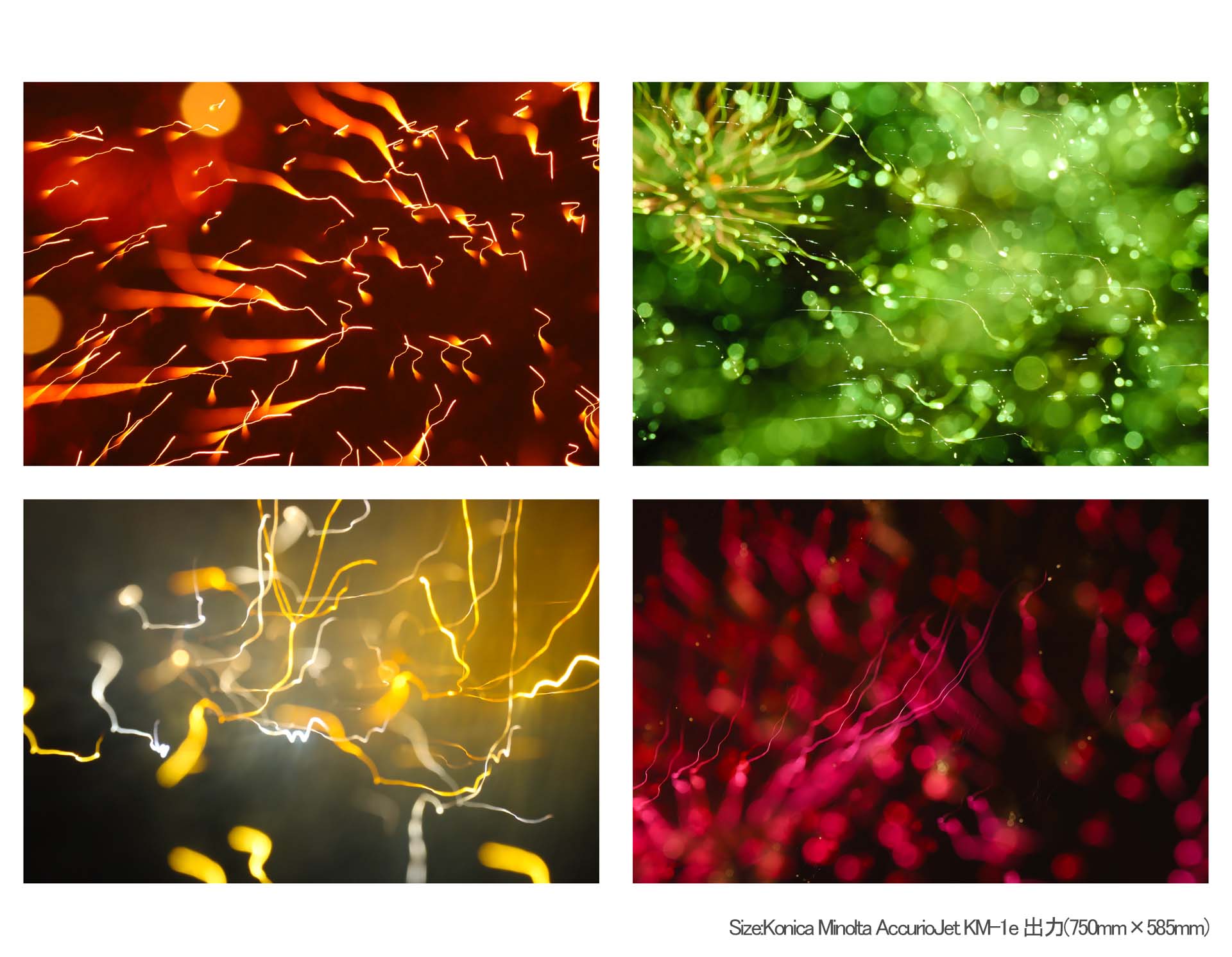 2023年11月11日(土)の「第3回川口花火大会」を今年も撮影しました。今回は、手持ち撮影した中からの4点になります。打ちあがった花火の星の色や花火玉の構造の違い、星の光跡と撮影時の手振れやピント調整が相まって偶然できた光の像と形を楽しんでいただけたらと思います。