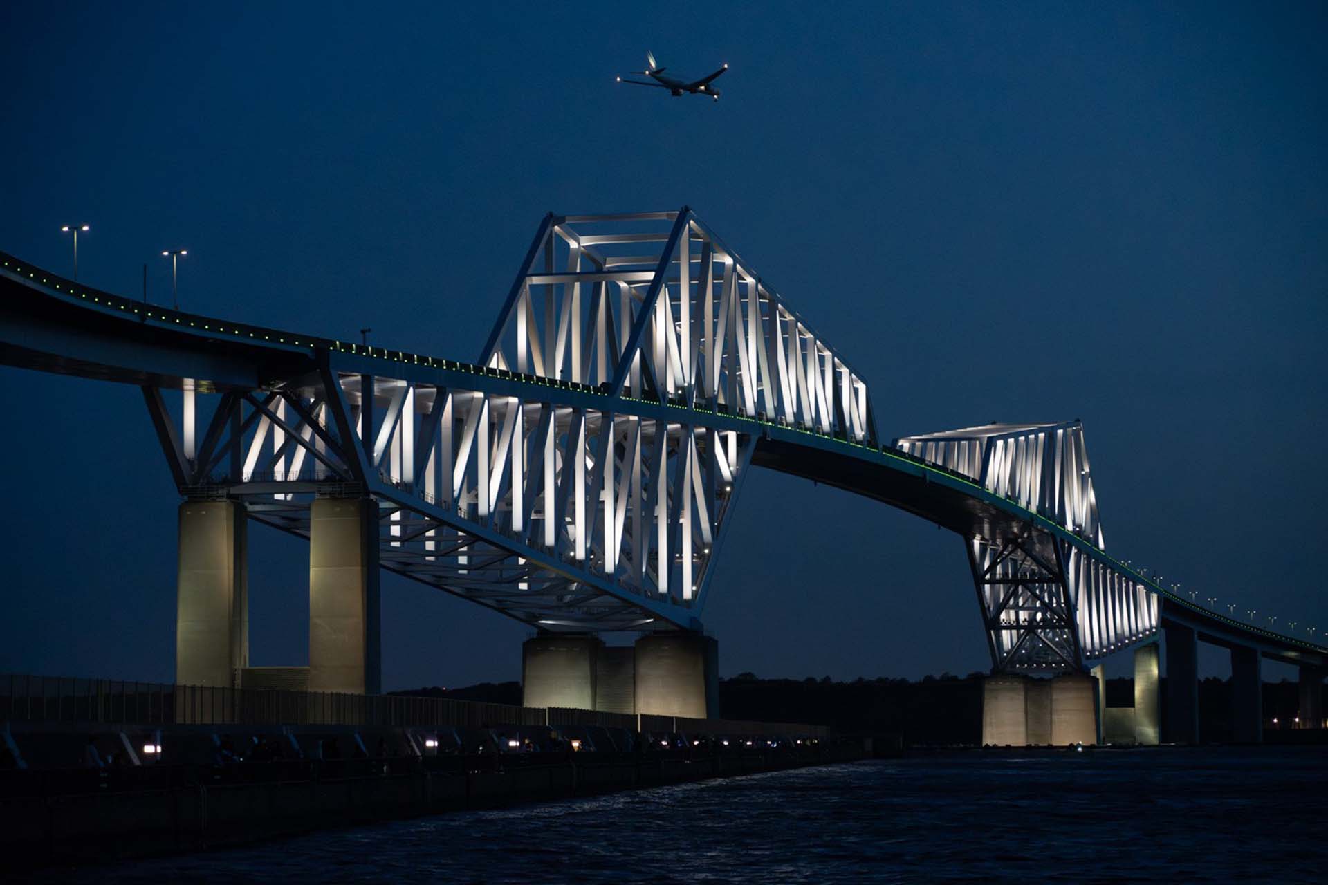 東京港の入口となる東京ゲートブリッジと、羽田空港に着陸する旅客機を両方ともきれいに映すためにあえて高感度設定でシャッター速度をあげて、旅客機が止まるように撮影しました。