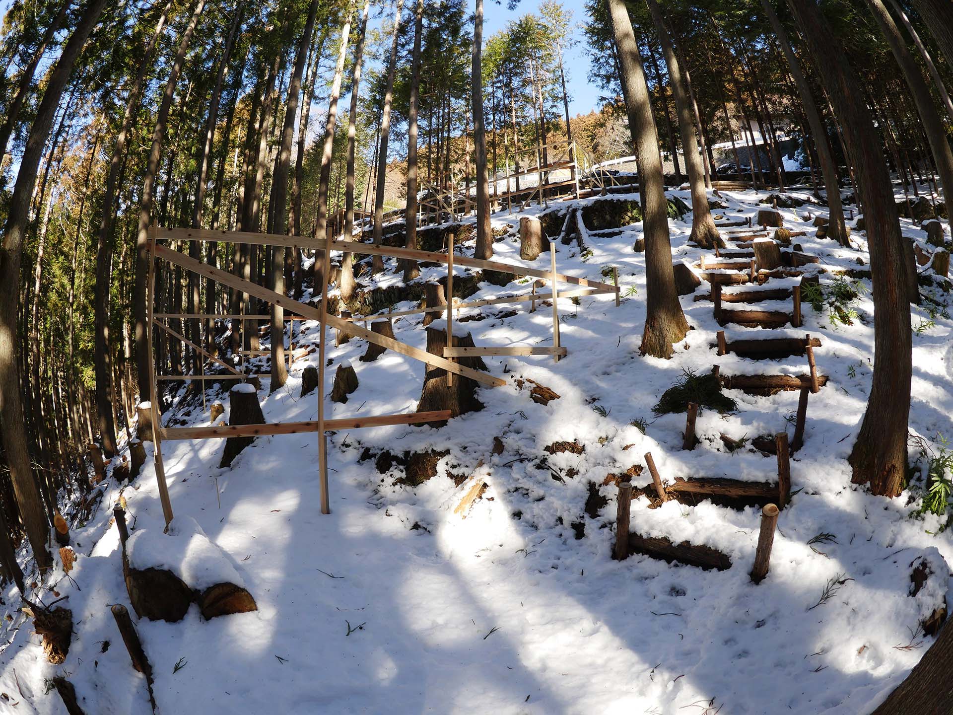 里山を間伐して造成中の「キャンプ場」雪化粧