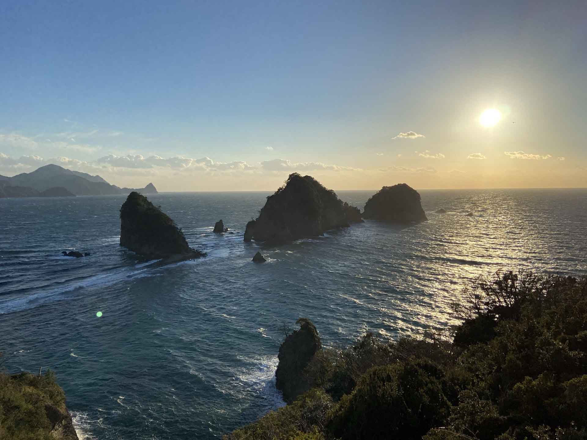 堂ヶ島旅行先の宿から望む三四郎島と朝日があまりに美しく感動的でした。朝の刻々と変化する光線のなかで、一日の始まりのエネルギーを風景とともに切り取ることができたのではないかと思います。よく見ると、朝日の右にカモメが映っています。