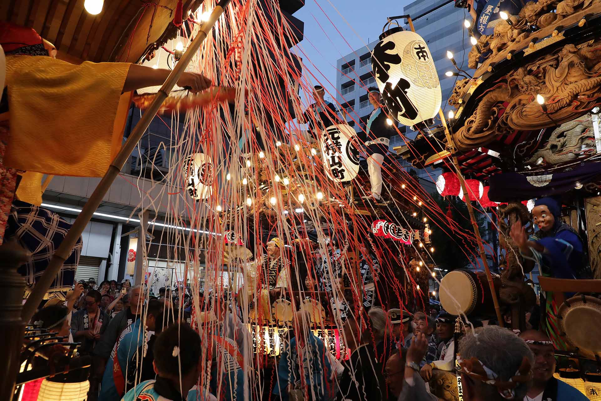 3基の山車がお囃子合戦を繰り広げ、佳境に入ったところで手前の山車から蜘蛛の糸が降り注がれて、お囃子を盛り上げてくれました。