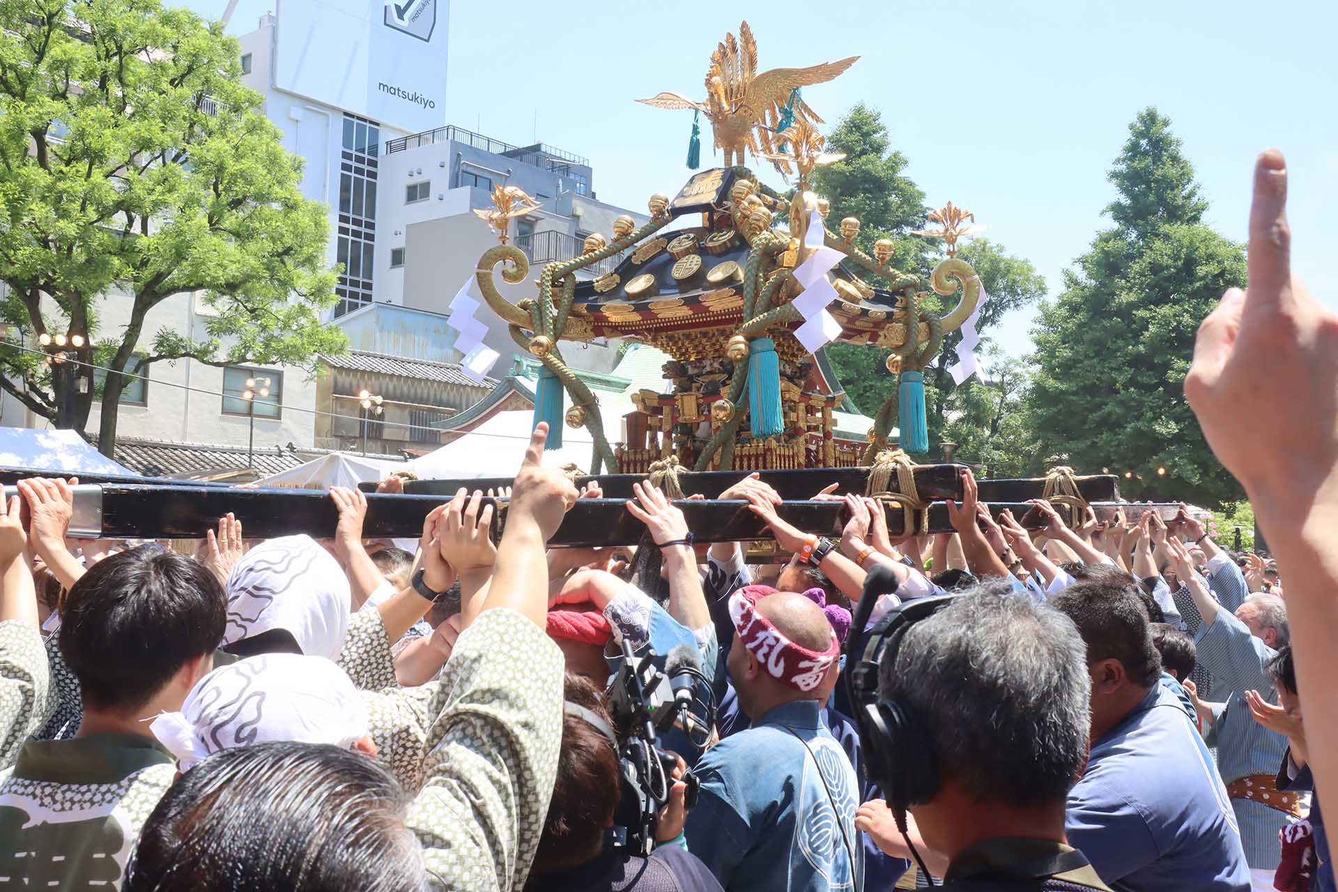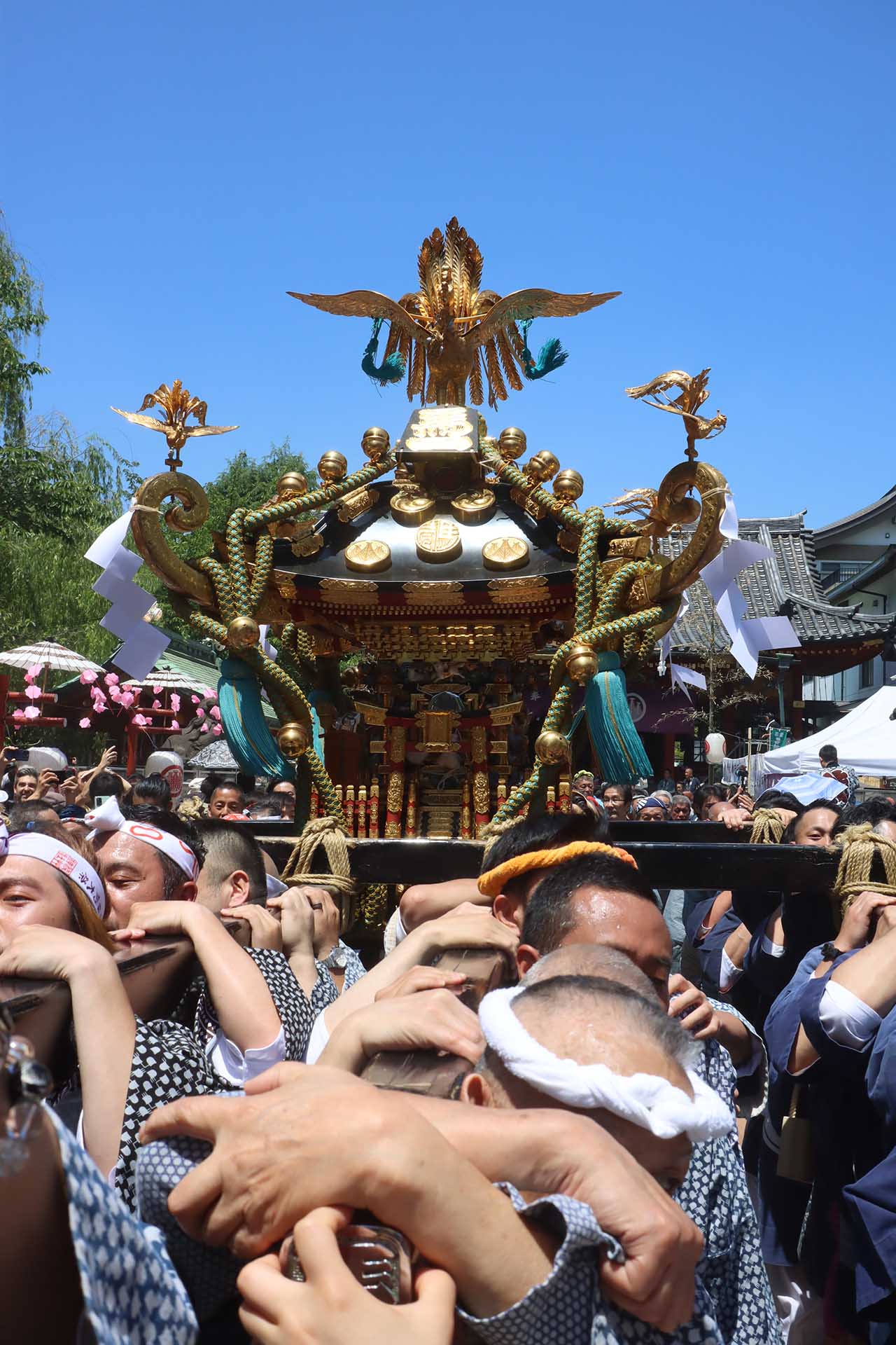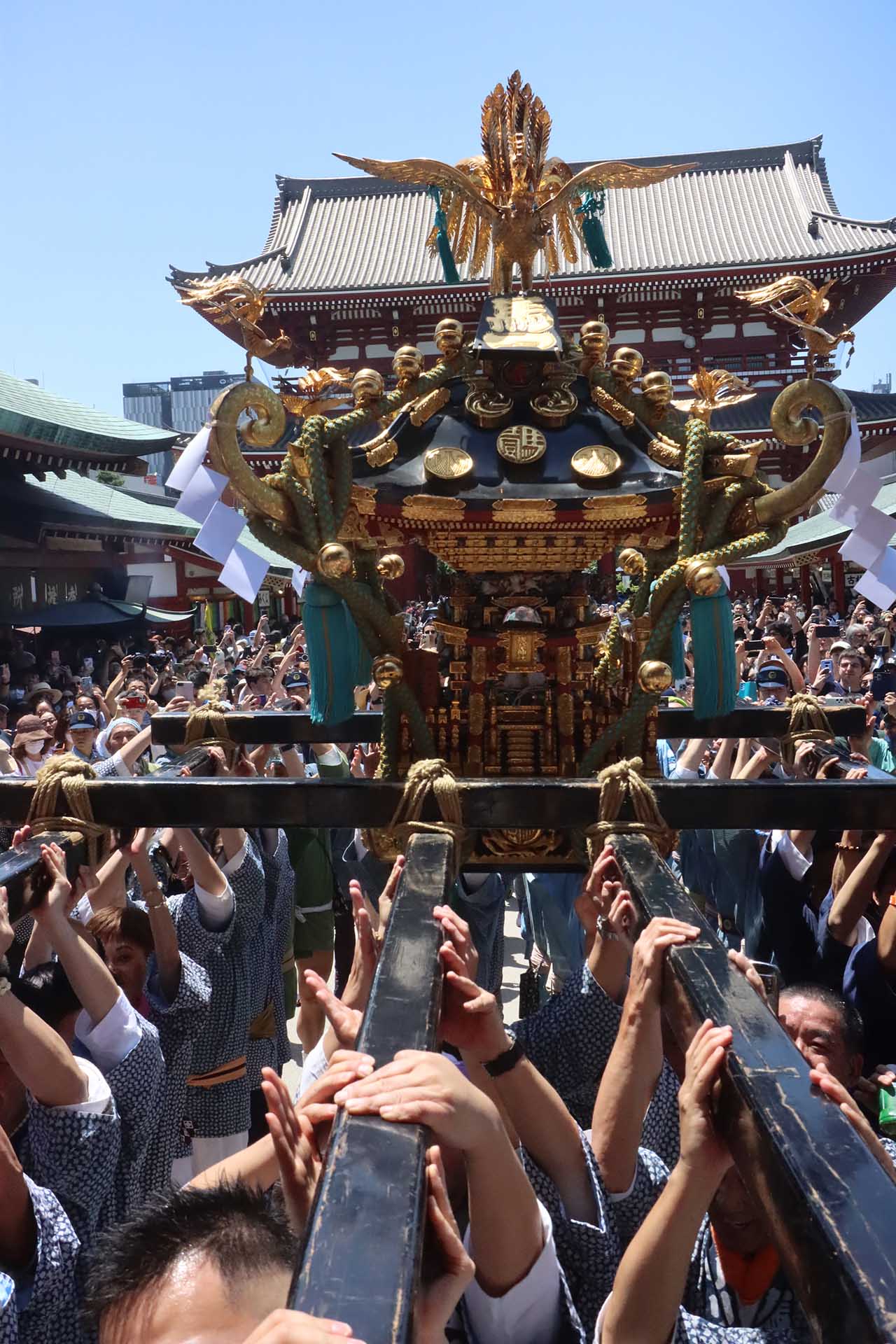 土曜日の昼、浅草神社の氏子町会のお神輿が、浅草寺本堂の裏に勢揃いし、浅草神社社殿前でお祓いを受ける。