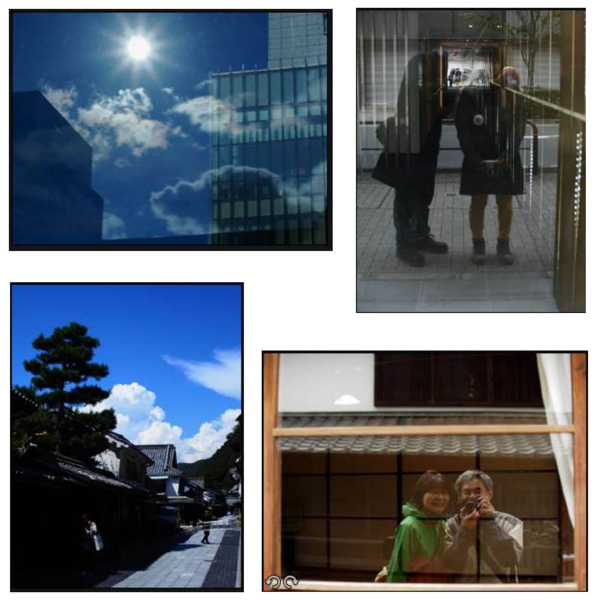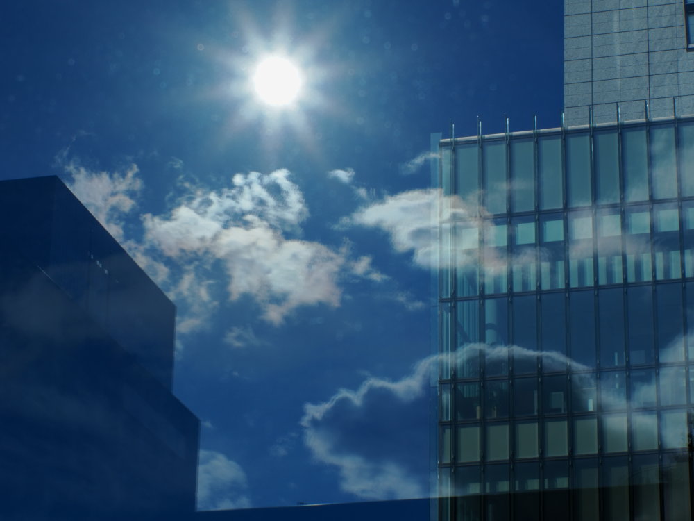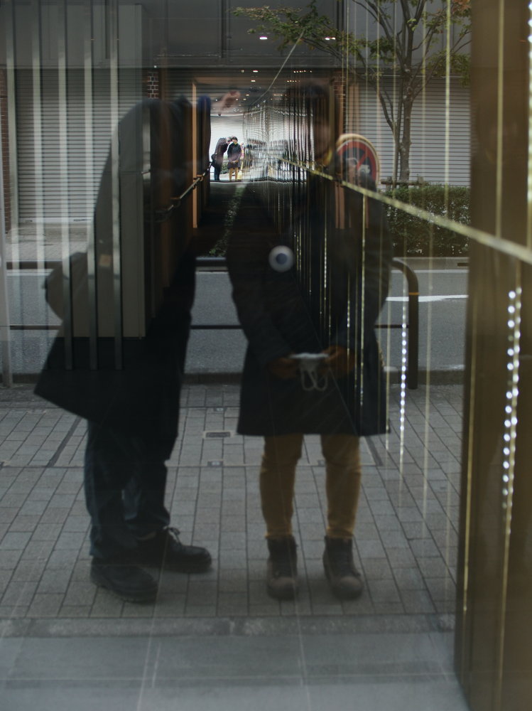 自撮りといっても、自撮り棒ではなく、建物のガラス面に映り込ませて撮影することで心象風景と重ねた表現を狙っています。
